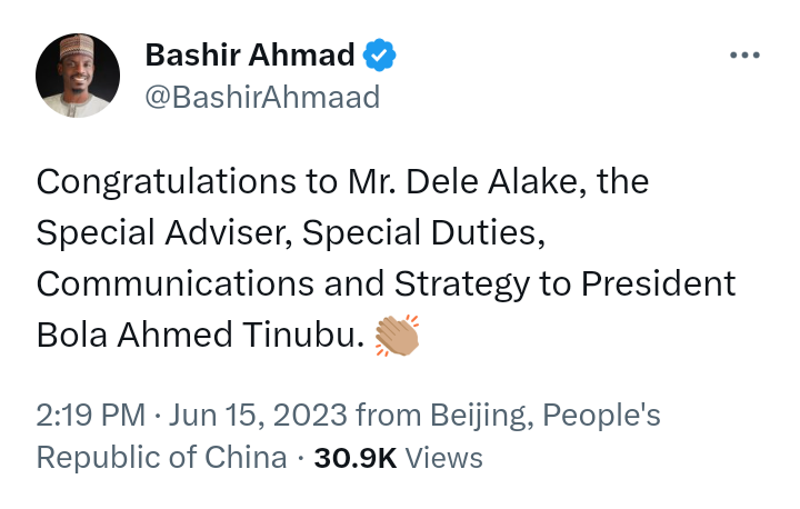 “Congratulations to Mr. Dele Alake, the Special Adviser, Special Duties, Communications and Strategy to President Bola Ahmed Tinubu.”