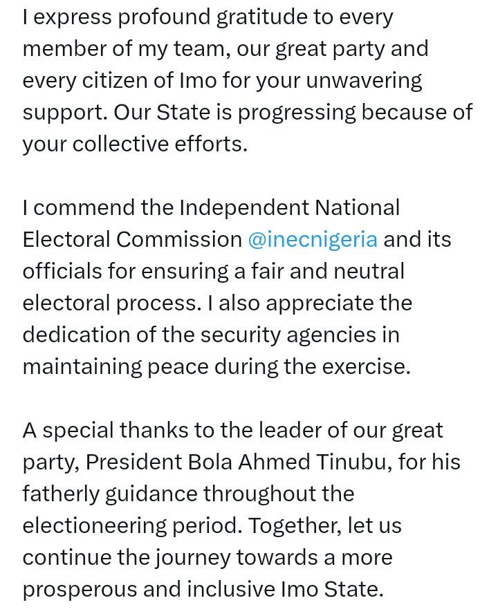 “A special thanks to the leader of our great party, President Bola Ahmed Tinubu, for his fatherly guidance throughout the electioneering period. Together, let us continue the journey towards a more prosperous and inclusive Imo State.