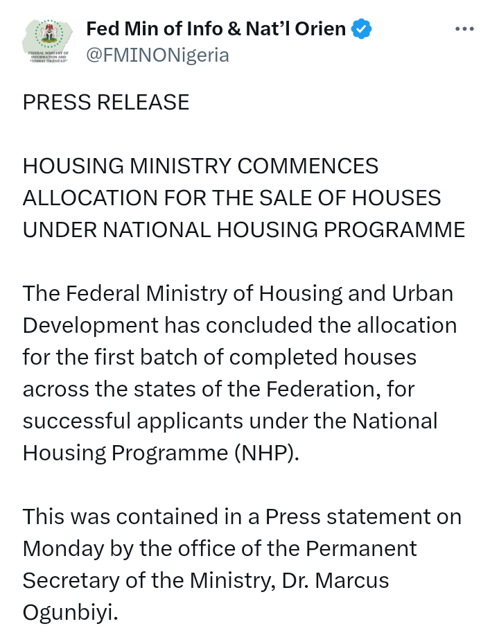 The Federal Ministry of Housing and Urban Development has concluded the allocation for the first batch of completed houses across the states of the Federation, for successful applicants under the National Housing Programme (NHP).