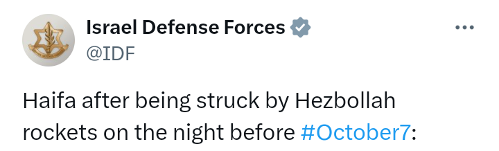 IDF disclosed: “Haifa after being struck by Hezbollah rockets on the night before #October7:”