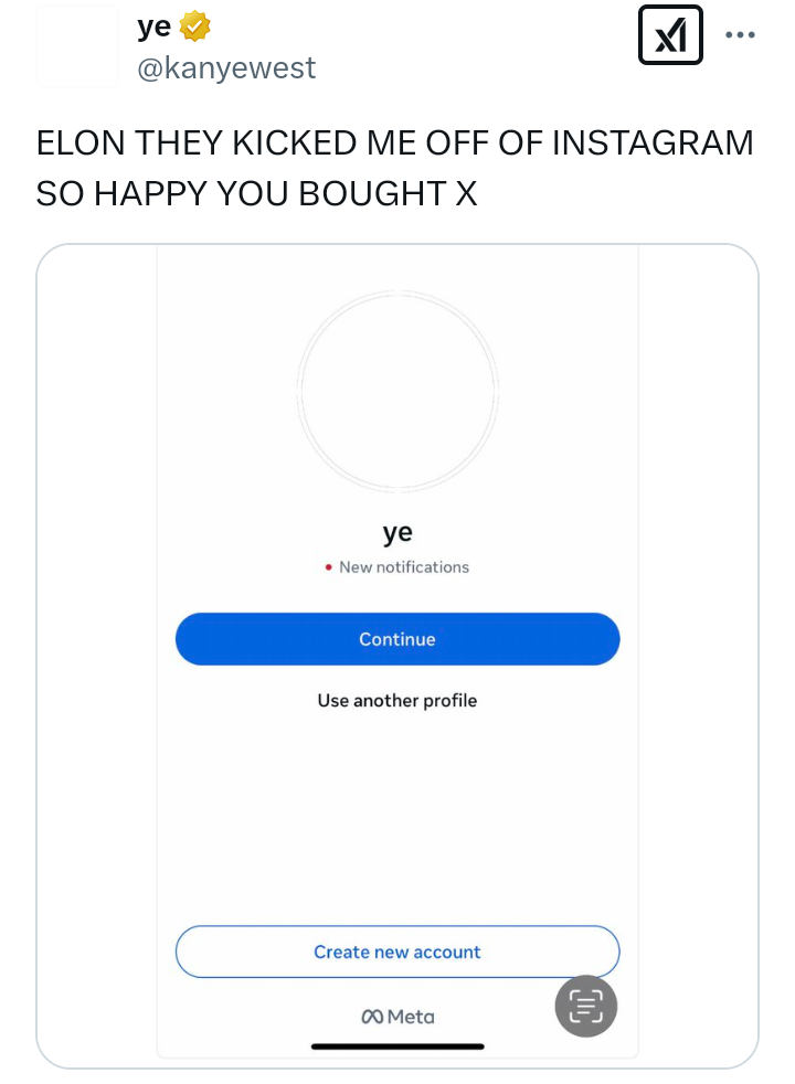 Ye wrote: “Elon they kicked off of Instagram